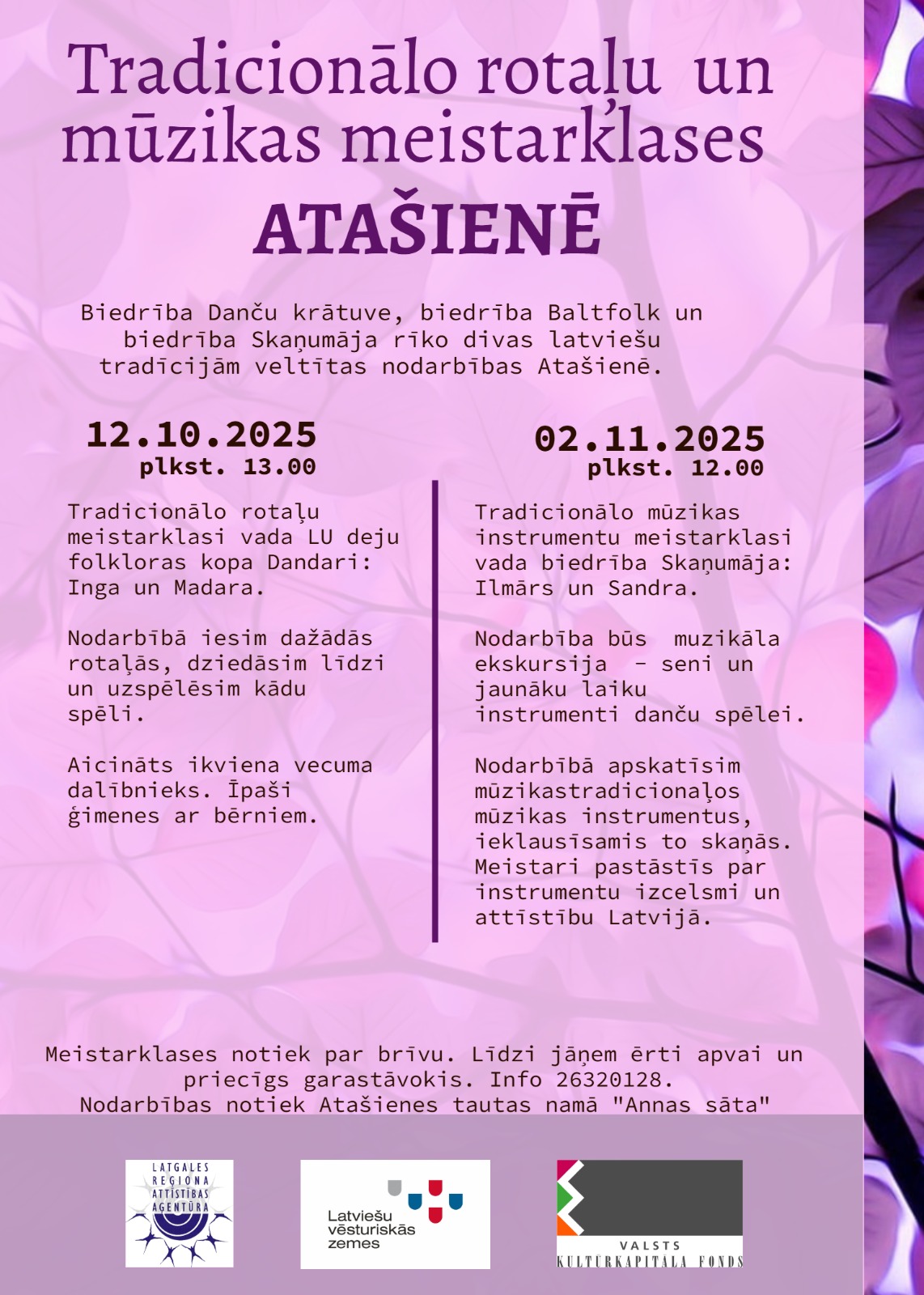 12.10. plkst. 13.00 Atašienes Tautas namā “Annas sāta” notiks tradicionālo rotaļu un danču meistarklase kopā ar LU deju folkloras kopu “Dandari”.