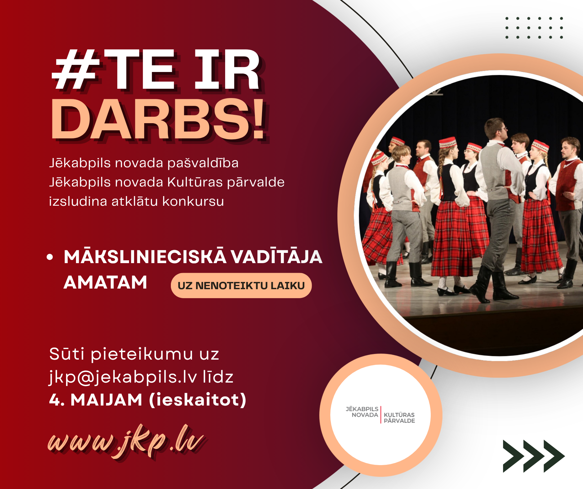 Jēkabpils novada Kultūras pārvalde (reģistrācijas numurs 40900009295) izsludina atklātu konkursu mākslinieciskā vadītāja amatam (uz nenoteiktu laiku)