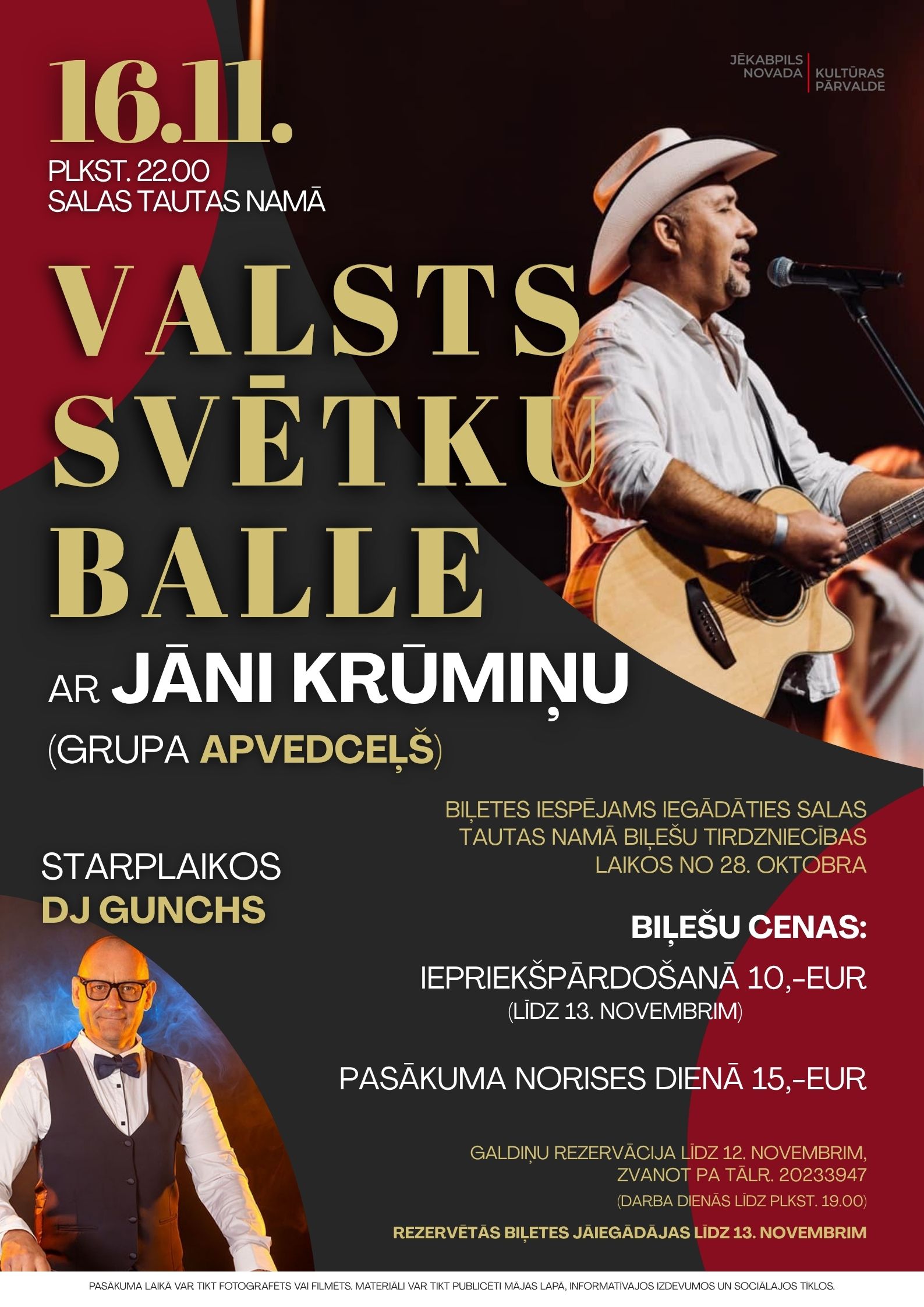 Galdiņu rezervācija līdz 12. novembrim, zvanot pa tālr. 20233947 (darba dienās līdz plkst. 19.00). Rezervētās biļetes jāiegādājas līdz 13. novembrim.