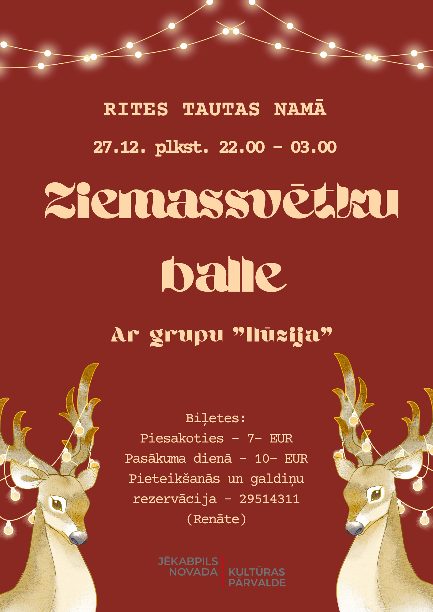 Vecgada balle ar Grupu “Ilūzija” 27.12.2025 - plkst.22.00 Rites Tautas nams 27.12. plkst. 22.00 Rites Tautas namā Vecgada balle ar Grupu “Ilūzija”. Biļešu cenas: piesakoties līdz 26.12. 7,- EUR pasākuma dienā 10,- EUR Galdiņu rezervācija – 29514311 (Renāte) Atpakaļ