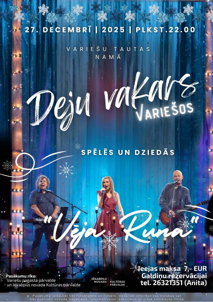 27.12. plkst.22.00 Variešu Tautas namā – Vecgada Deju vakars ar grupu “Vēja runa”.