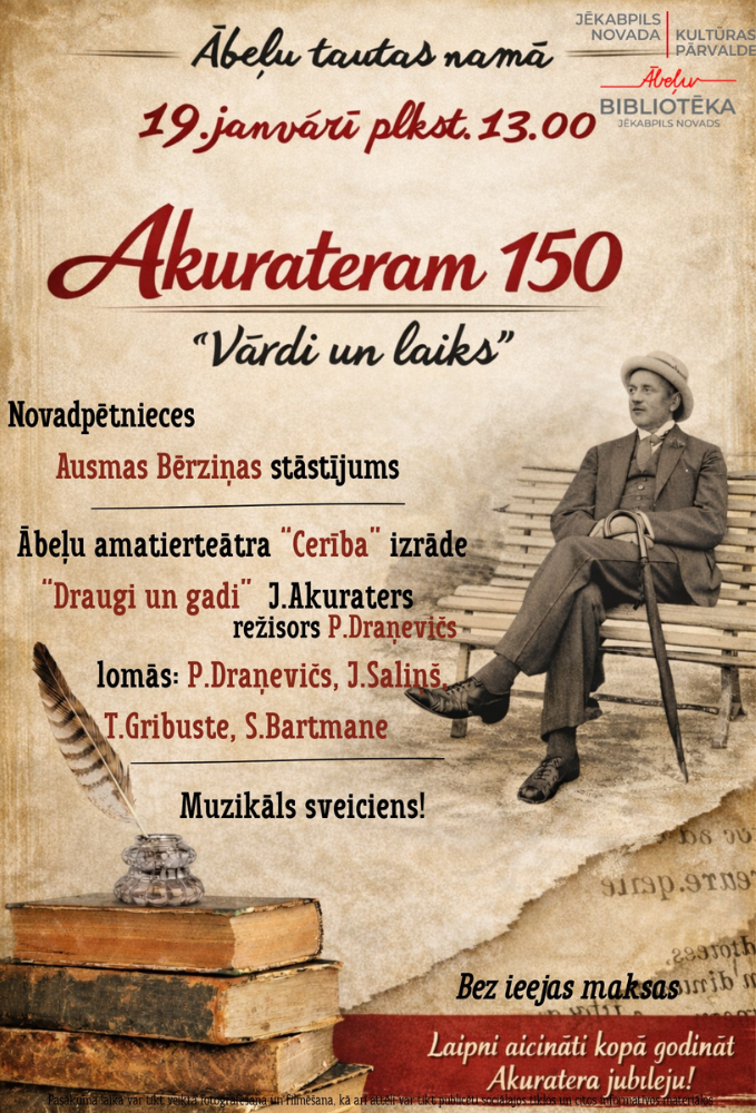 19.janvārī plkst.13.00 Ābeļu Tautas namā norisināsies Jāņa Akuratera 150. dzimšanas dienai veltīts pasākums “Akurateram 150. vārdi un laiks”