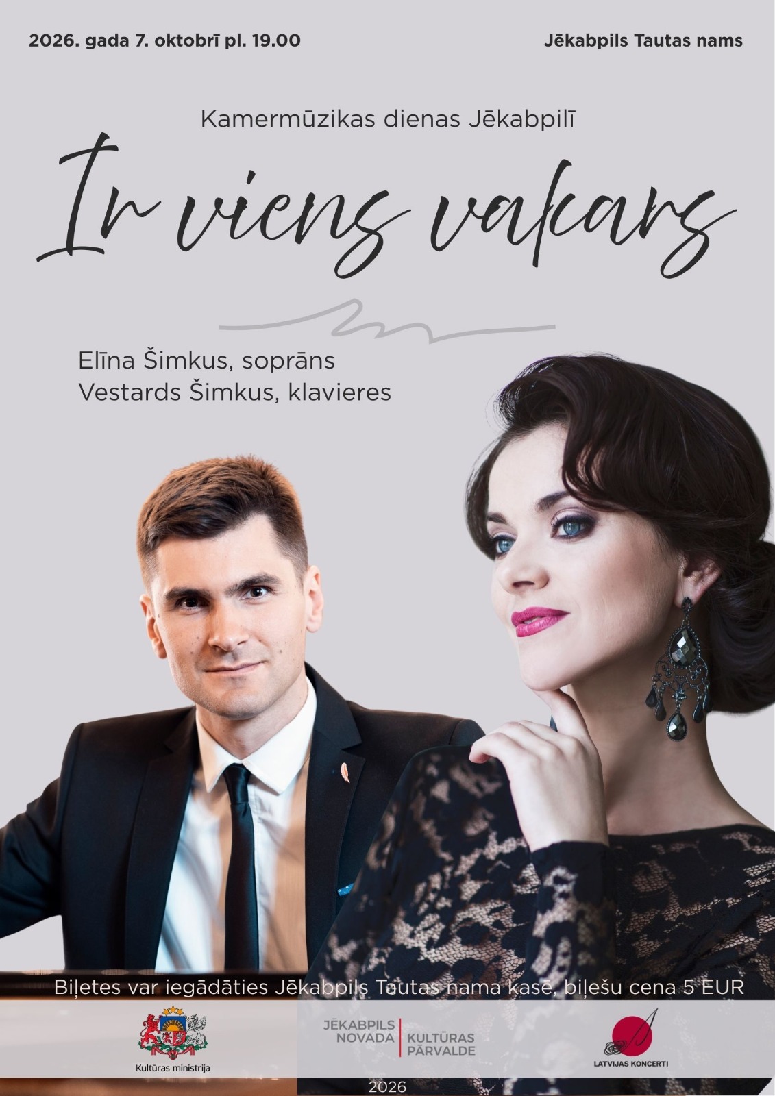 Jēkabpils Tautas namā viesosies šarmantās balss īpašniece Elīna Šimkus (soprāns) un virtuozais pianists Vestards Šimkus.