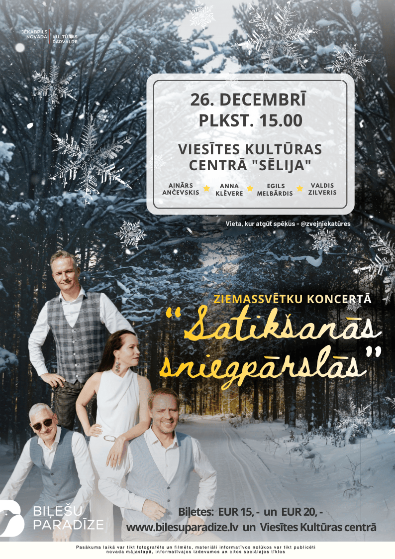 26.12. plkst. 15.00 Viesītes kultūras centrā “Sēlija” notiks Ziemassvētku koncerts “Satikšanās sniegpārslās”.