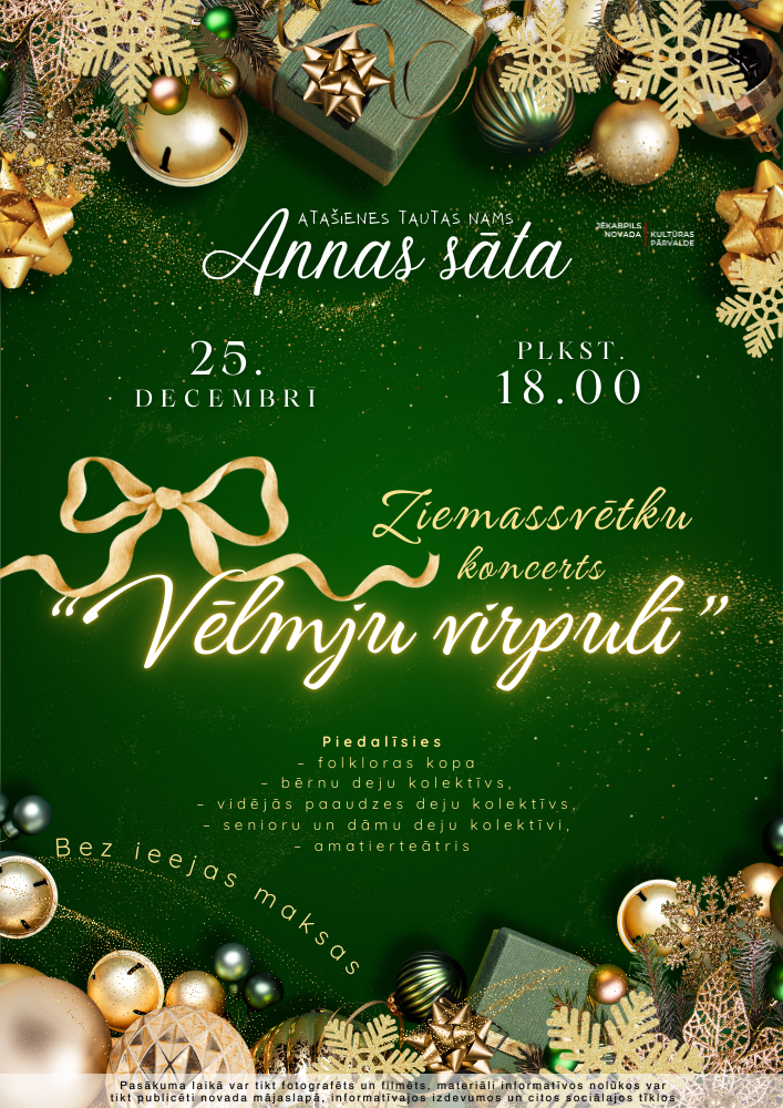Ziemassvētku koncerts “Vēlmju virpulī” 25.12.2025 - plkst.18.00 Atašienes Tautas nams “Annas sāta” 25.12. plkst. 18.00 Atašienes Tautas namā notiks Ziemassvētku koncerts “Vēlmju virpulī”. Piedalās Atašiemes amatiermākslas kolektīvi. Bez ieejas maksas Atpakaļ
