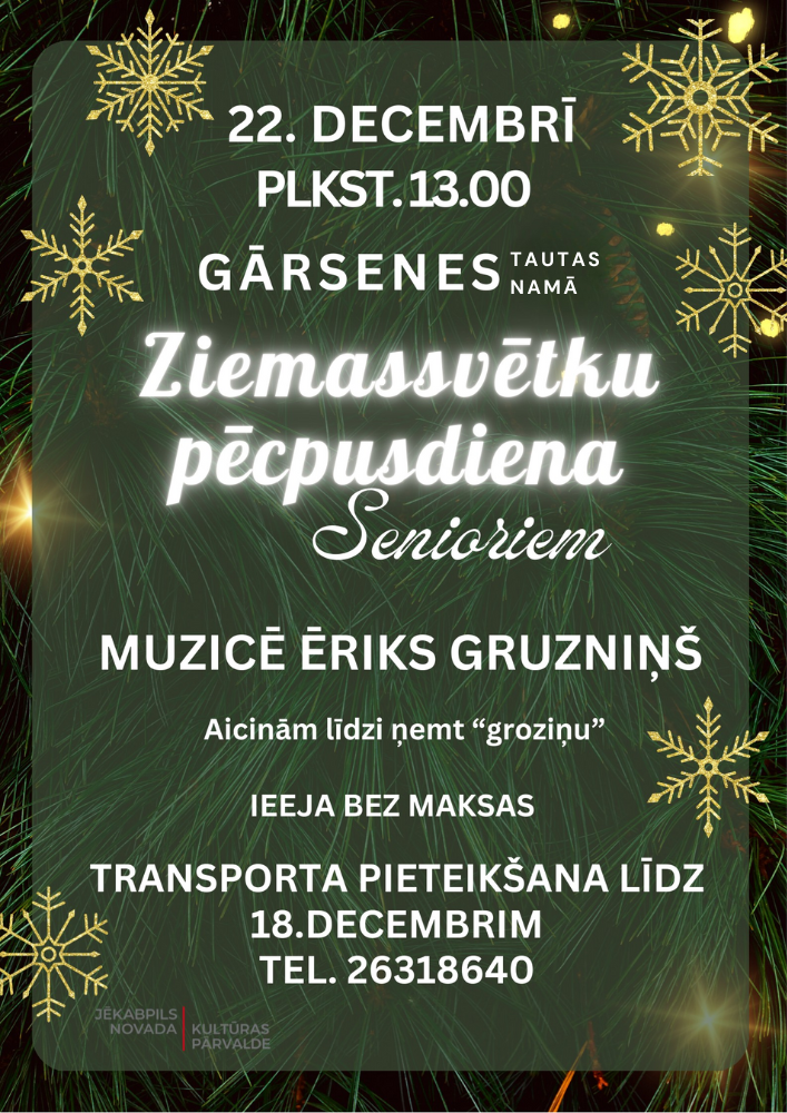 Aicinām uz senioru pēcpusdienu Ziemassvētku noskaņās. Muzicēs Ēriks Gruzniņš. Pasākums pie galdiņiem. Aicinām ņemt līdzi groziņu.